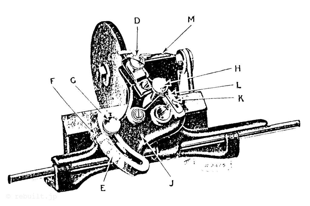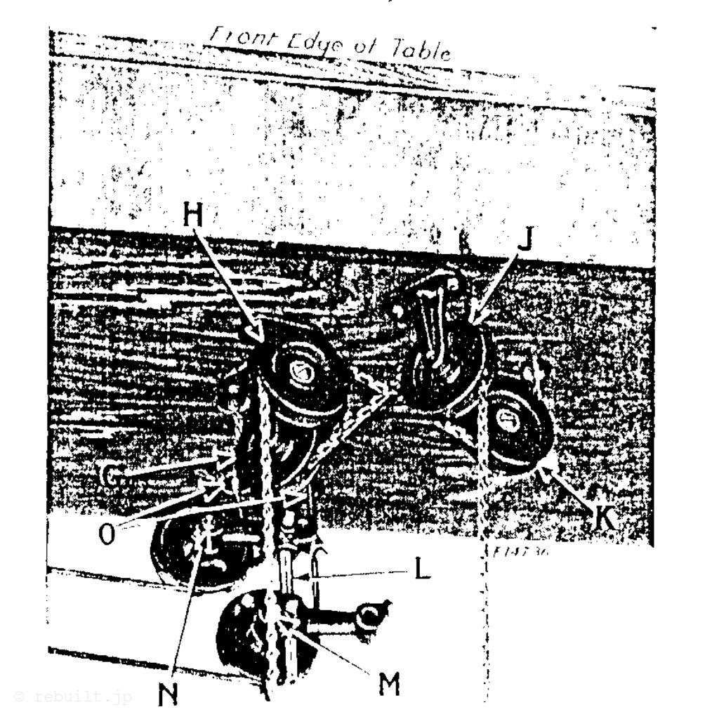 左側のフットペダルから1本のチェーンをまっすぐ上に伸ばし、プーリー(H)の上を通ってプーリー(K)の下を通り、テーブルの穴を通してクランプ昇降レバー(B、図16)に固定します。2本目のチェーンを右側のフットペダルからまっすぐ上に伸ばし、プーリー(J)の上を通ってプーリー(G)の下を通り、テーブルの穴を通して始動レバー(C、図18)に固定します。機械を、アイドラブラケット一式(L)の後方にある床またはテーブルのシャフトに取り付けられたプーリーで駆動する場合は、アイドラとアイドラアームは、図3のNに示すように、垂直ロッド穴から最も遠いアームの2つの穴にプーリーを取り付けて組み立ててください。機械を機械後部とテーブル前部の間にあるシャフトから駆動する必要がある場合は、図3のMに示すように、2つのプーリーを垂直ロッド穴に最も近いアームの穴に取り付けて組み立ててください。