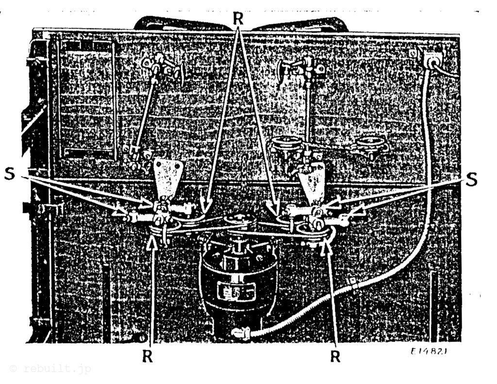 2台の機械を並列運転するために1台のモーターを取り付ける場合は、図4に示すように、モーターを2台の機械の中心線の真下に、駆動プーリーをテーブルの前方に向けて取り付けてください。ベルトアイドラプーリー(R、図4)は、図4に示すようにアーム(S)に取り付け、チェーンプーリーは機械に付属の設計図に従って取り付けてください。各ミシンに個別のモーターをペアで使用する場合、テーブルの下にベルトアイドラーは使用されず、モーターはミシンのプーリーの真下に、各ミシンがテーブルに対して設置されているのと同じ角度で配置されます。