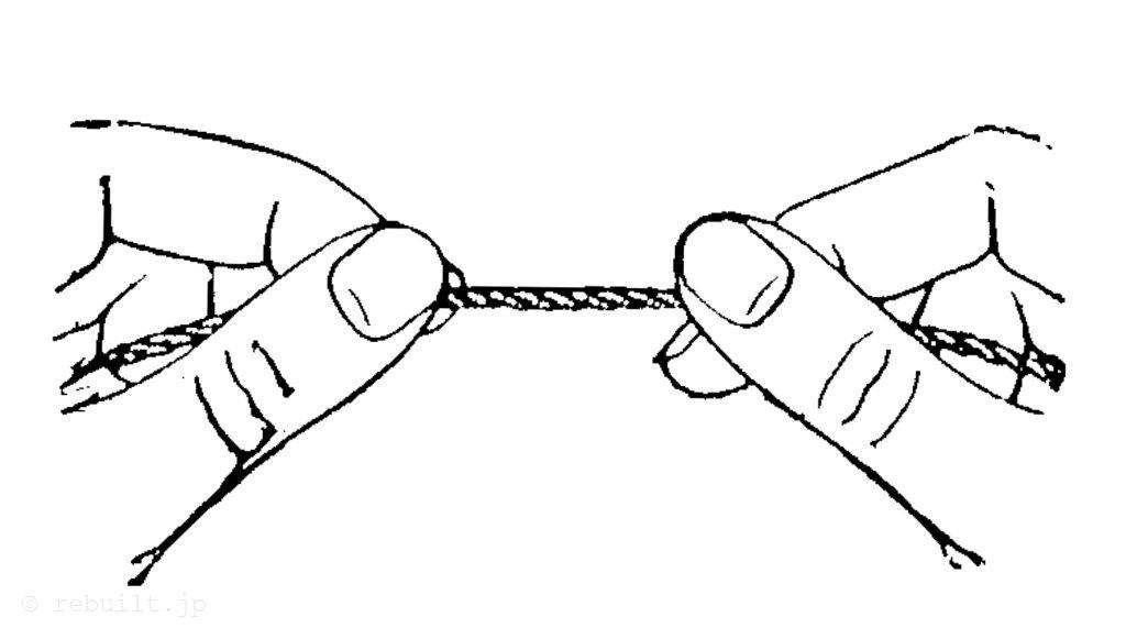 糸は上記のように持ちます。右手の親指と人差し指の間で糸を自分の方にひねります。左撚りの場合は糸がより強く撚り合わされ、右撚りの場合は撚りがほどけます。