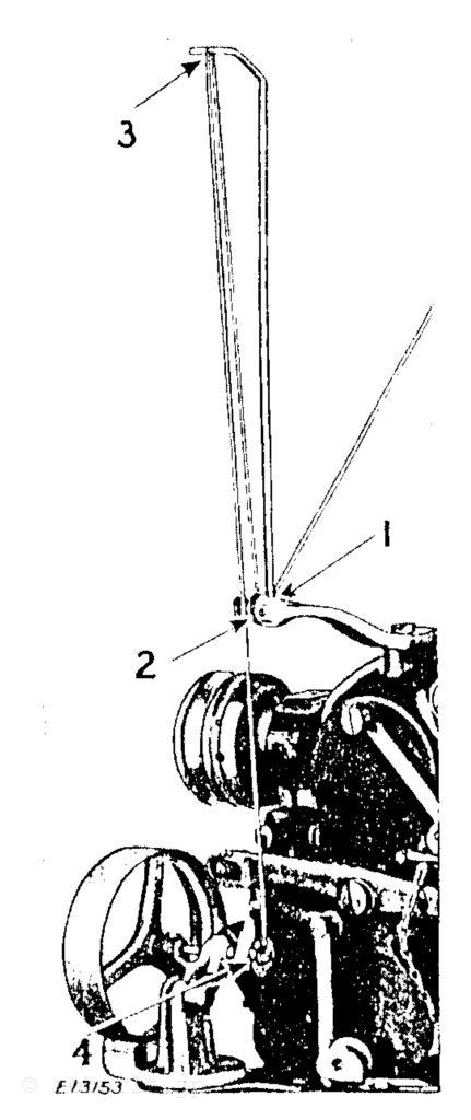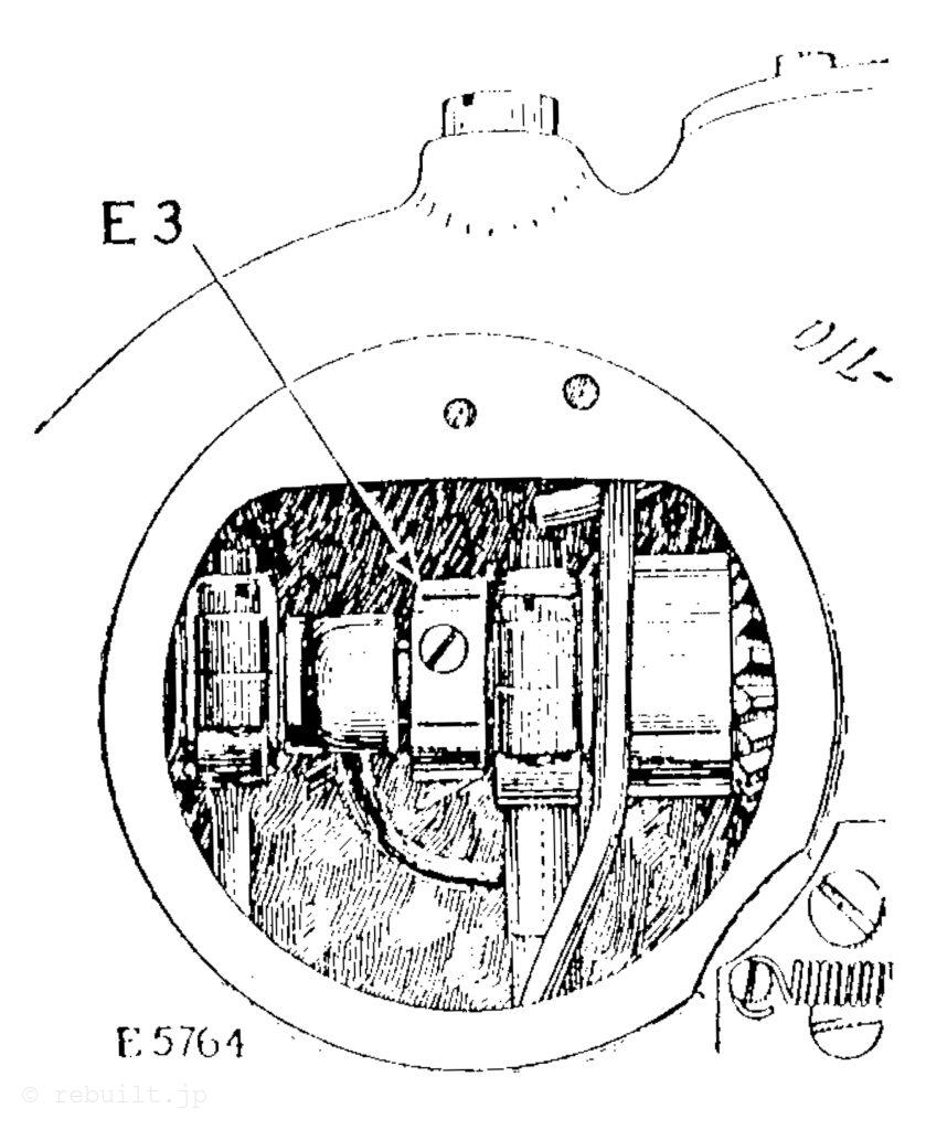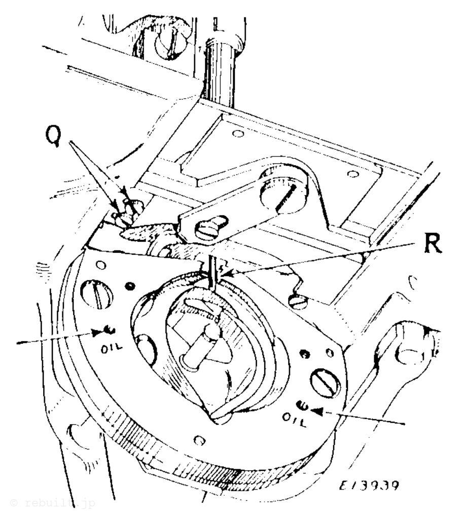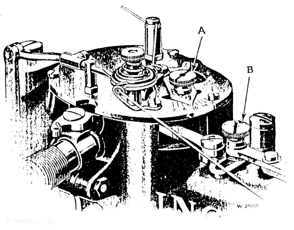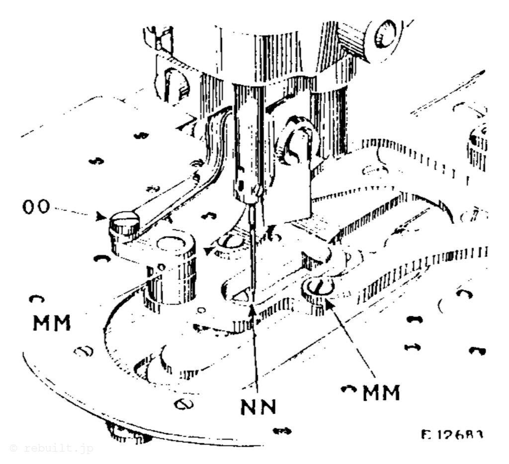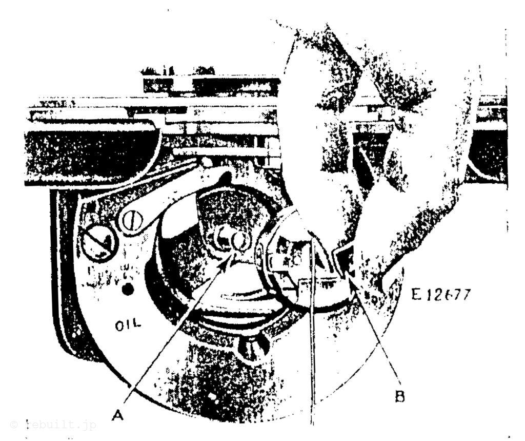 バーリングカム(WW、図28)を設定する必要がある場合は、カム側面のマークが直立シャフトのマークと一直線になるようにすることで、カムの正しい位置を確認できます。