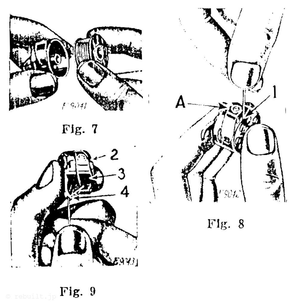 注:71-47型ミシンで使用されているボビンケースの位置決めピンには、アイレット(図9の4)は付いていません。