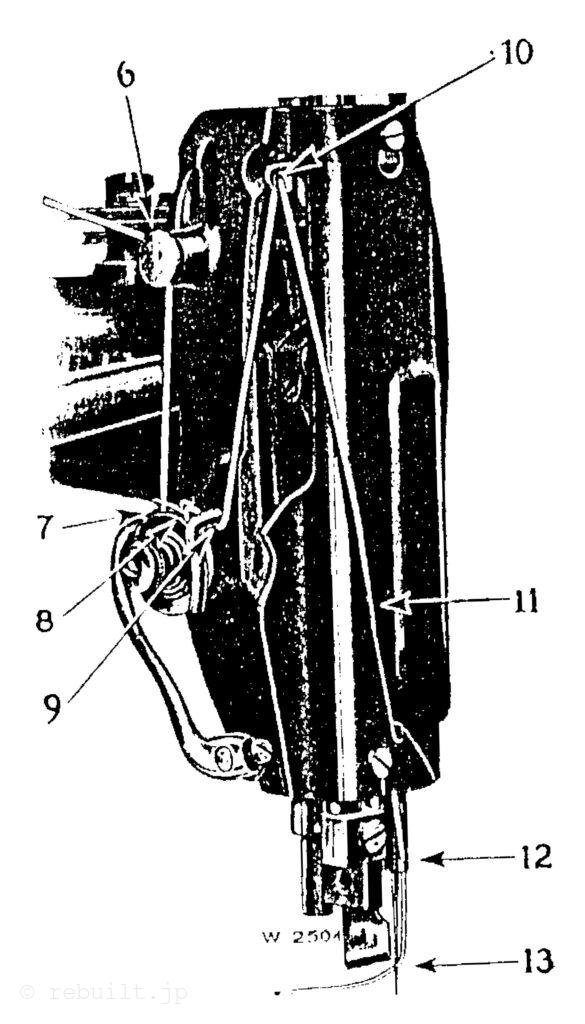 糸巻きから糸を引き出し、ミシン上部の垂直ロッドにある下側の穴(1、図11)に通し、糸案内ガイド(2、図11)を通って、糸通し穴(3、図11)を通し、糸調子皿(4、図11)の間を後ろ側から回し、糸通し穴(5、図11)を通し、糸案内ガイド(6、図12)に通し、糸調子皿(7、図12)の間を下から後ろから前に通し、糸引き上げバネ(8、図12)に通し、糸調子ガイド(9、図12)の下を通し、糸引き上げレバーの先端にある穴(10、図12)を後ろから前に通し、面板の溝(11、図12)に通し、針棒の下端にある穴(12、図12)に通し、針穴(13、図12)を前から後ろに通します。縫い始めるために、針穴から約2インチ(約5cm)の糸を引き出します。