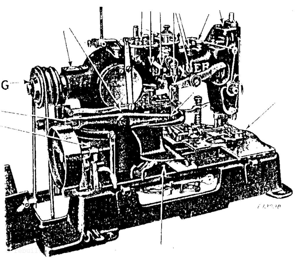 ベッドの下にある部品にアクセスするには、ヒンジ付きスプラッシュガードの下部と背面にある蝶ナットを緩め、ガードを後ろに倒し、機械のプーリーからベルトを外し、機械をヒンジで後ろに倒します。注油箇所は図18に示されています。シャトルベアリングには1日2回注油してください(図20参照)。ネジ(G、図17)を取り外し、ネジ穴を通してプーリーのボールベアリングに少量のボールベアリング潤滑剤を塗布し、その後ネジ(G)を元に戻します。「シンガーミシン会社」が販売している「ボールベアリング潤滑剤」を使用してください。