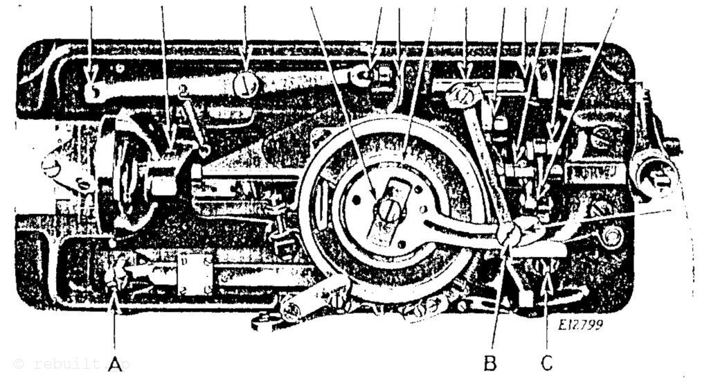 針棒フレームのピットマンは、2本のネジ(図14のB)で調整できます。これらのネジを緩め、ミシンがボタンホールの最初の側面を縫い上げているときに、右側の針先とナイフが正確に一直線になるか、ナイフの左側に切断間隔の半分だけずれるように針棒フレームを動かします。