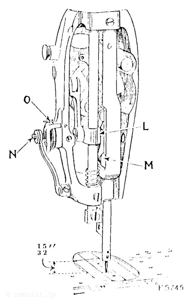 糸引き上げバネ(図19のO)の張力は、針穴が下降中に生地に到達するまで、針糸のたるみを解消するのに十分な強さである必要があります。糸引き上げバネの張力は、張力調整ネジ(図19のN)を右に回すと張力が増加し、左に回すと張力が減少するように調整します。