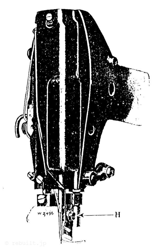 縫い目の間の切断間隔は、ミシン台の溝にあるネジ(図1のH)で調整します。切断間隔を広くするには、このネジを緩めて溝の中で後ろに動かします。切断間隔を狭くするには、ネジを溝の中で手前に動かしてから締め付けます。