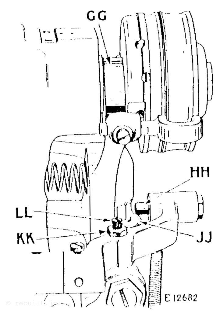 スタートレバー(EE、図23)をストップカムから外れるまで前方に引き出し、ナイフレバー(1、図14)を押し下げて、ナイフバー駆動レバー(J、図14)の後端にあるスタッドが、連結リンクのスロット上端に当たるように保持します(図14のK参照)。ナイフバークランプ(L、図19)のネジを緩め、ナイフバーの上部とナイフバーストップ上部の内側との間に約1/64インチの隙間ができるようにナイフバーを調整し、ナイフバークランプのネジをしっかりと締めます。