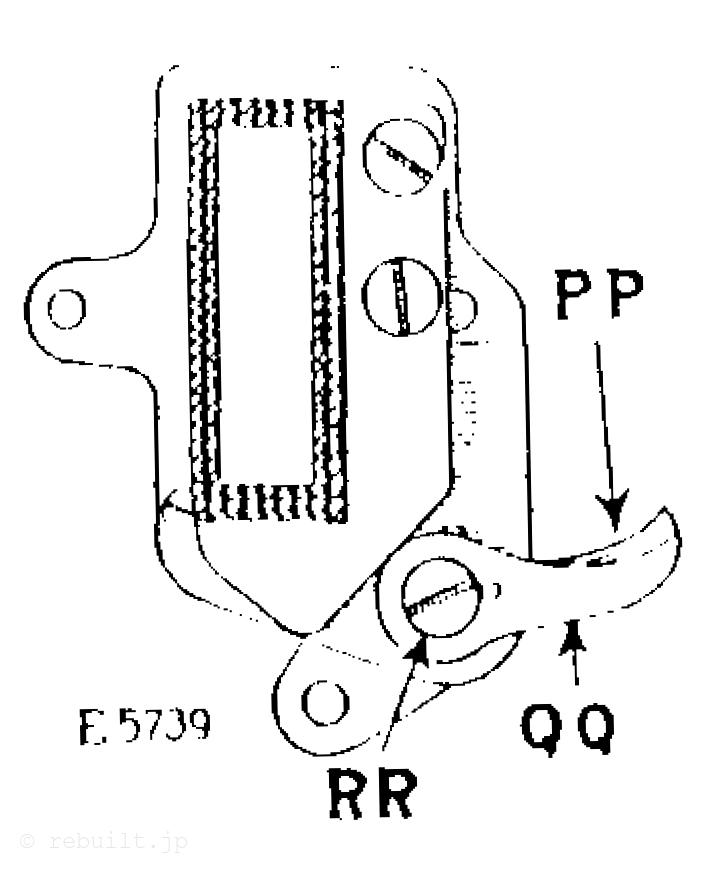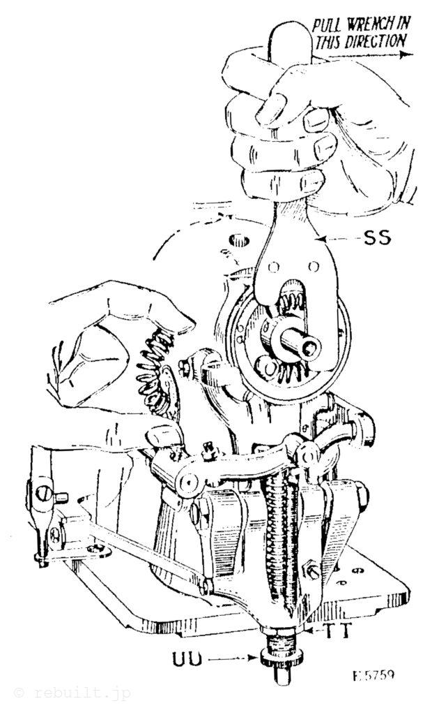 ストップモーションインターロッキングロッド(FF、図23)の張力は、このロッドがストップカムの切り欠きから飛び出さないようにするのに十分な強さで、かつミシンを停止させる際にアームシャフトの動きを遅くするのに十分な強さである必要があります。これにより、ストップカムスプリングの破損を最小限に抑えることができます。厚手の生地にボタンホールを作る場合は、インターロッキングロッドの張力を弱める必要がある場合があります。そのためには、ロックナット(TT、図27)を緩め、ネジ(UU、図27)を回して希望の張力になるまで調整し、その後ロックナットをしっかりと締めてください。