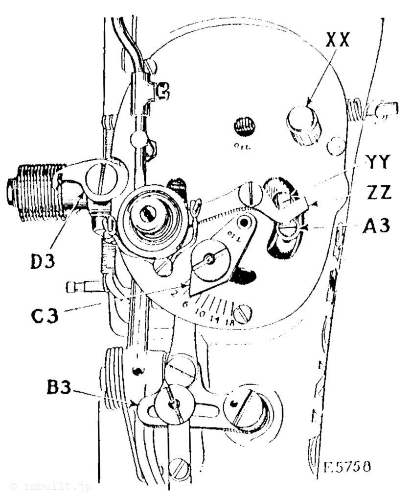 バーリングトリッピング機構を調整およびタイミング調整するには、バーリングステッチインジケーター(C3、図29)を図29に示すように数字の6に設定し、始動レバー(EE、図23)を前方に引き、ミシン駆動プーリーを手で左に回して、針棒フレームレギュレーター(B3、図29)が前進ストロークの終端に達するまで回します。次に、ハンドラチェット(E、図14)を使用してミシンをラチェット操作し、バーリングレバー(VV、図28)がバーリングカム(WW、図28)に落ち込むまで回します。