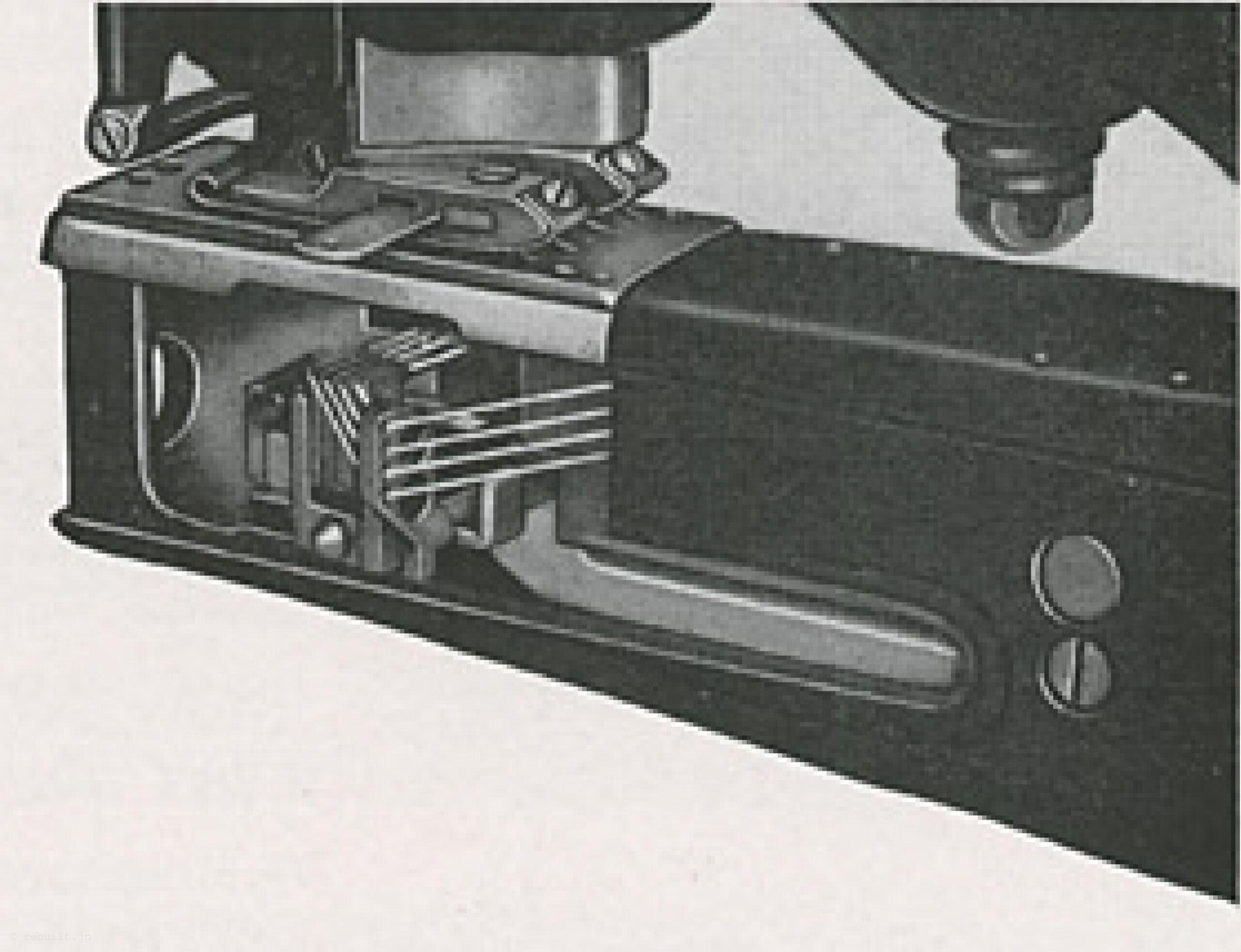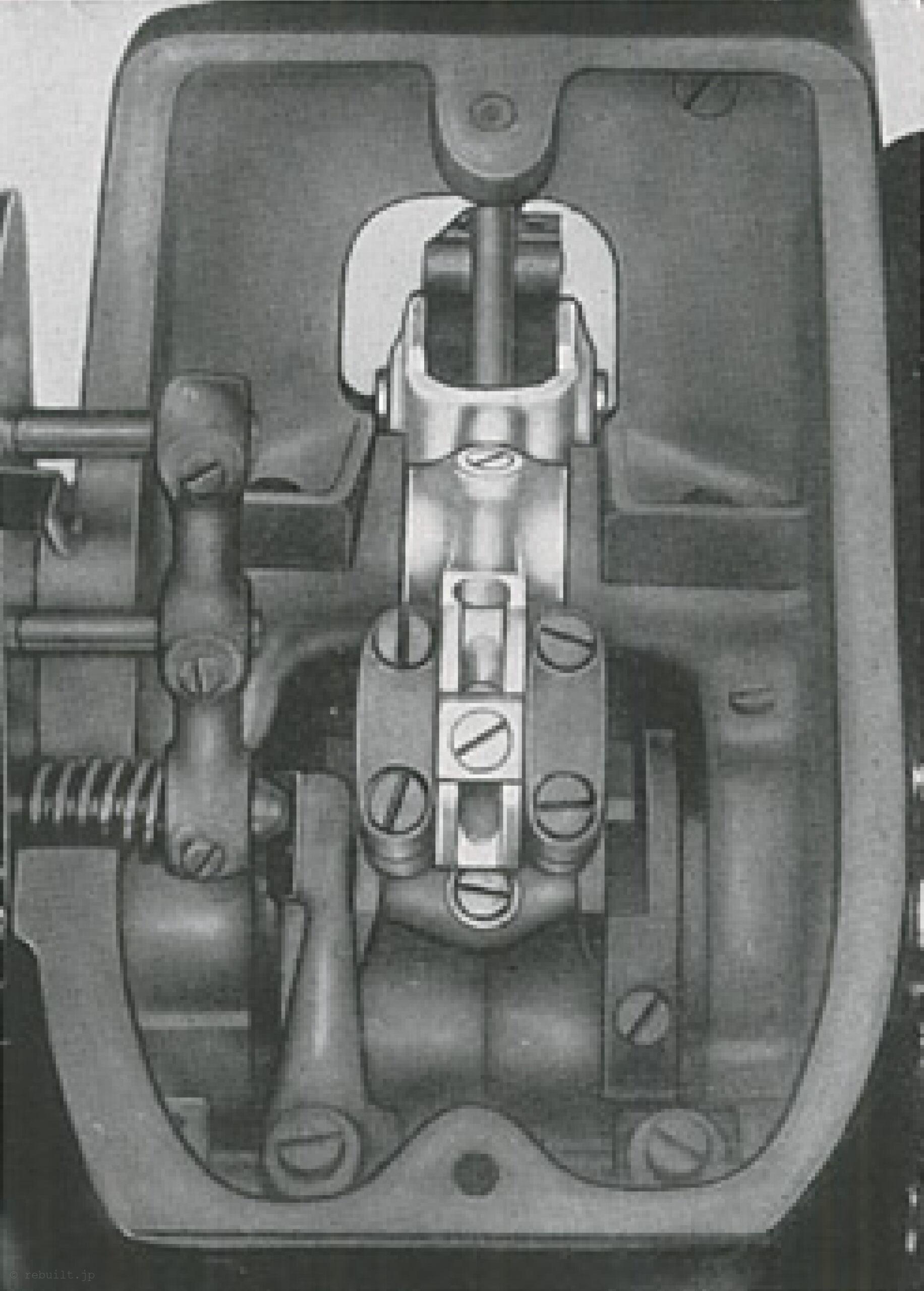 これはミシン全体の中で最も重要なユニットの一つです。十分な支持面を確保することで、主軸のクランクから針棒自体への駆動力がスムーズに伝達されます。この機構は、針棒に横方向のスラストがほとんどかからないように配置されています。針棒レバー自体は軽量の鍛造鋼で作られており、ミシンの寿命全体を通してトラブルのない動作を保証します。