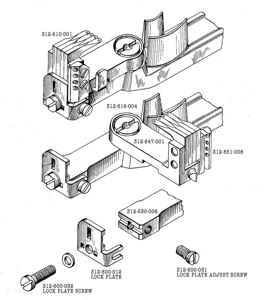 トリマーアームとニードルバーの関係は、トリマーアーム調整ネジNo. 312-600-010 (2) を前後に操作することで調整します。前側のネジを右に回すと、トリマーアームはニードルバーに近づきます。後側のネジを右に回すと、トリマーアームはニードルバーから遠ざかります。トリマーアームがニードルバーに向かって最も左の位置になるまでハンドホイールを回します。トリマーアームネジ(No. 313-600-002)を締め付け、トリマーシャフトの垂直方向の遊びがなくアームを所定の位置に保持するのに十分な摩擦力をかけます。トリマーアームがニードルバーに最も接近した状態で、前後のネジ(No. 312-600-010)を同時に操作します。ニードルバーの側面とクロススレッドリンク(No. 312-730-005)が最も近い位置にあるときの間隔は、0.029~0.033インチ(0.029~0.033インチ)です。この調整により、クロススレッド機構が適切に縫製されるようになります。